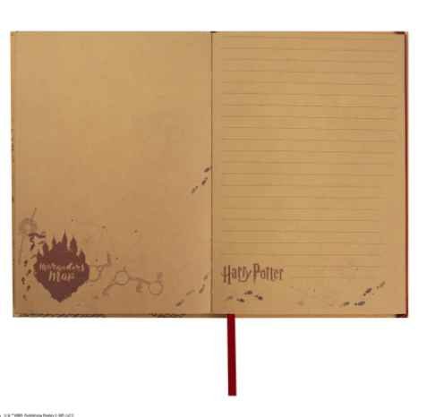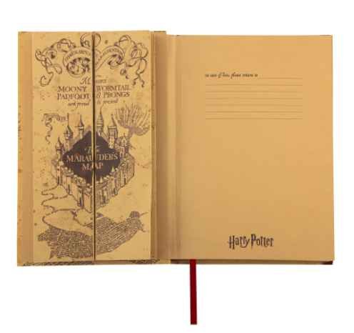 Dans le même esprit que ses stylos baguette, Cinereplicas a réalisé un produit à la fois de collection et de papeterie : un carnet avec une carte du maraudeur pliable incluse.